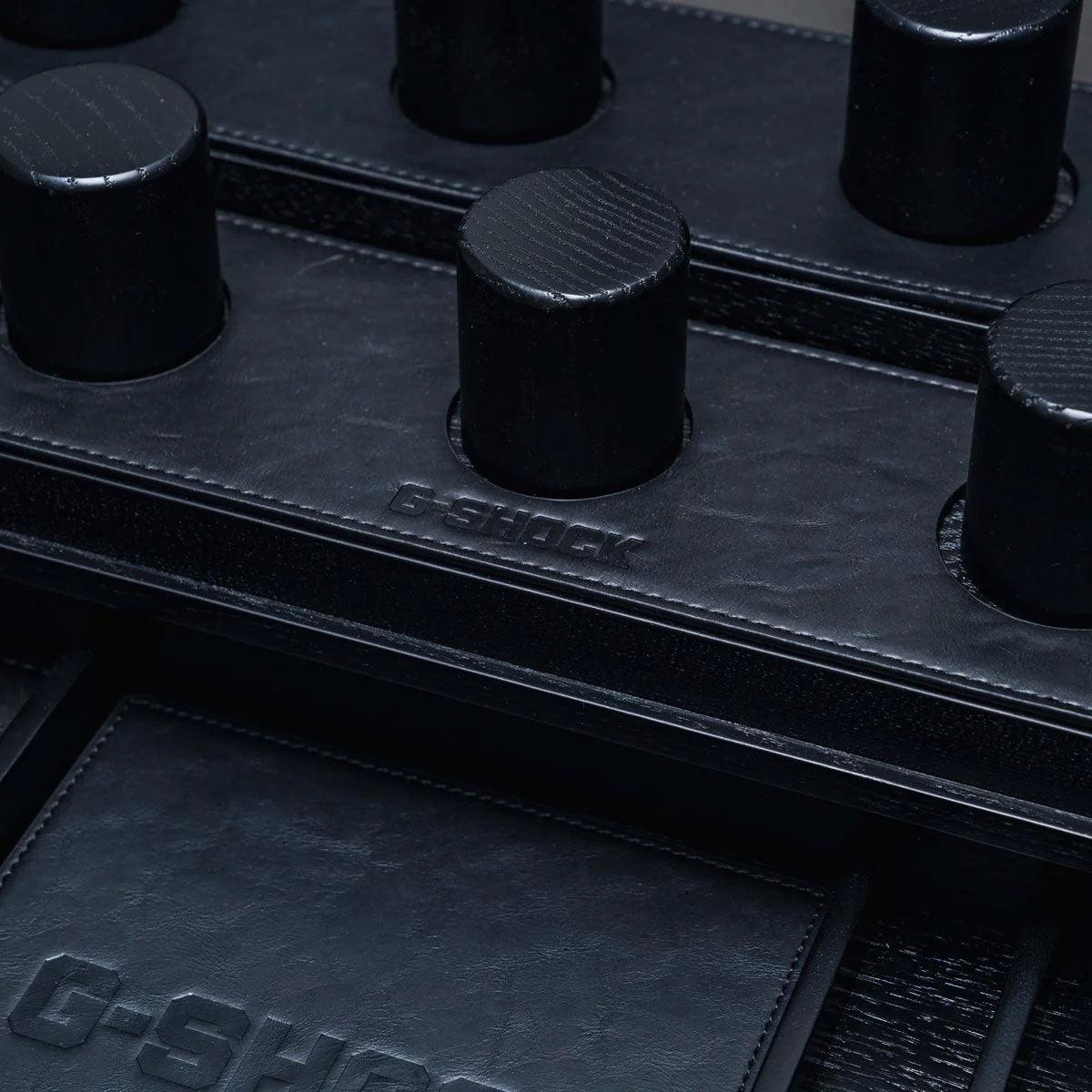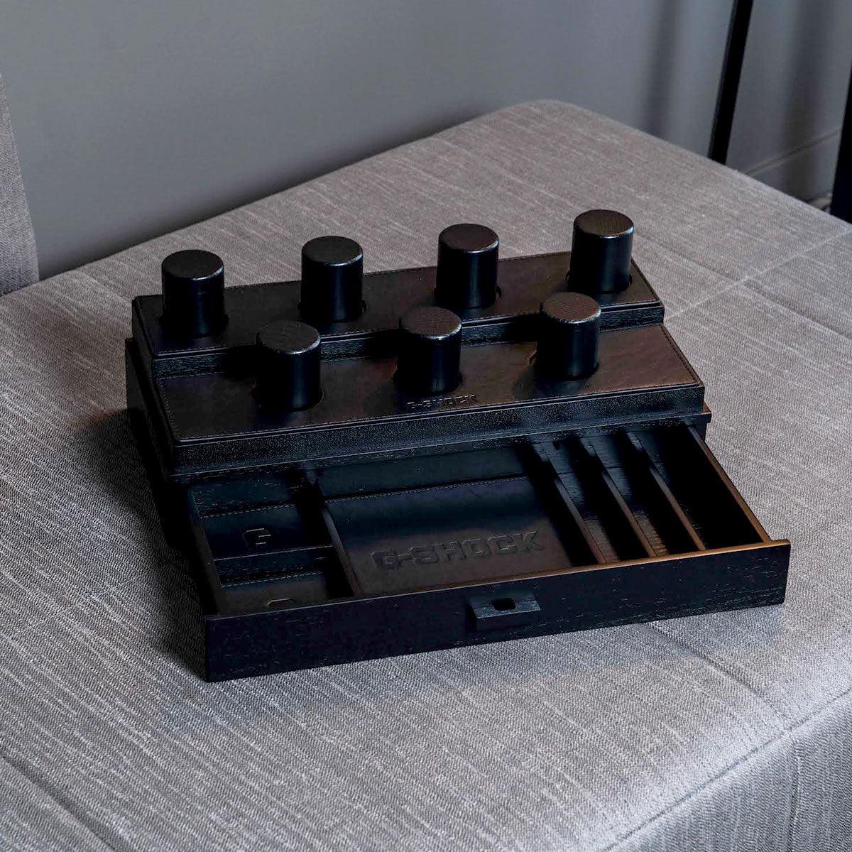 G-Shock x Holme & Hadfield watch display case. This two-tiered case displays seven watches on the acrylic-covered top and has a drawer to hold accessories. The clear top allows the case to serve as a display stand and also allows solar-powered watches to charge if placed near a light source.